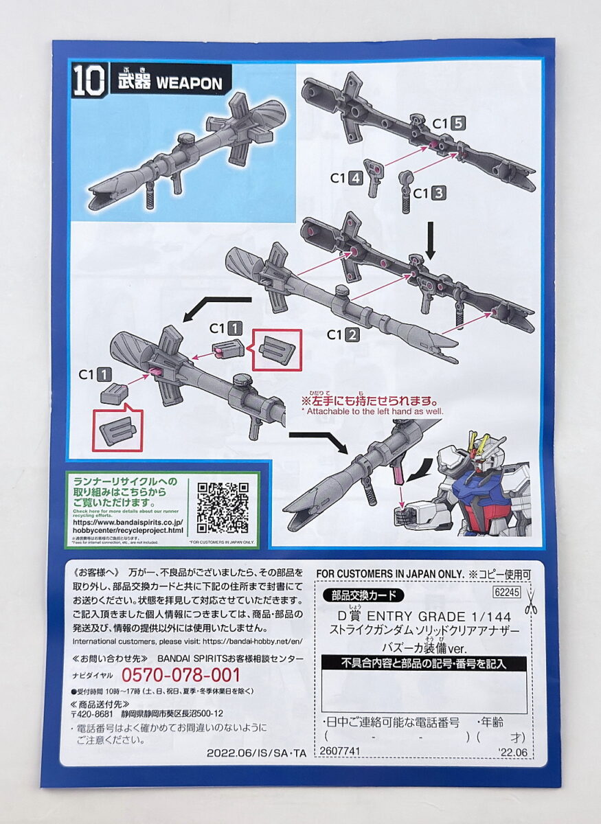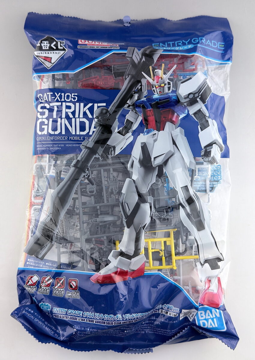 今回のキットは2022年の「一番くじ 機動戦士ガンダム ガンプラ2022」のD賞として設定されていたもので、先に発売されていた(2021年12月)「ENTRY GRADE 1/144 ストライクガンダム(ライトパッケージVer.)」をベースに一部成型色(青と赤部分)をクリアーカラーへ変更、さらに当時はまだ店頭販売商品には付属していなかったバズーカを新規で追加した内容となっています。