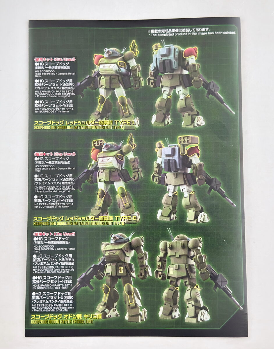 「HG スコープドッグ用拡張パーツセット3 レビュー」をご参考ください(※薄緑のパーツは拡張パーツセット4には付属しません)